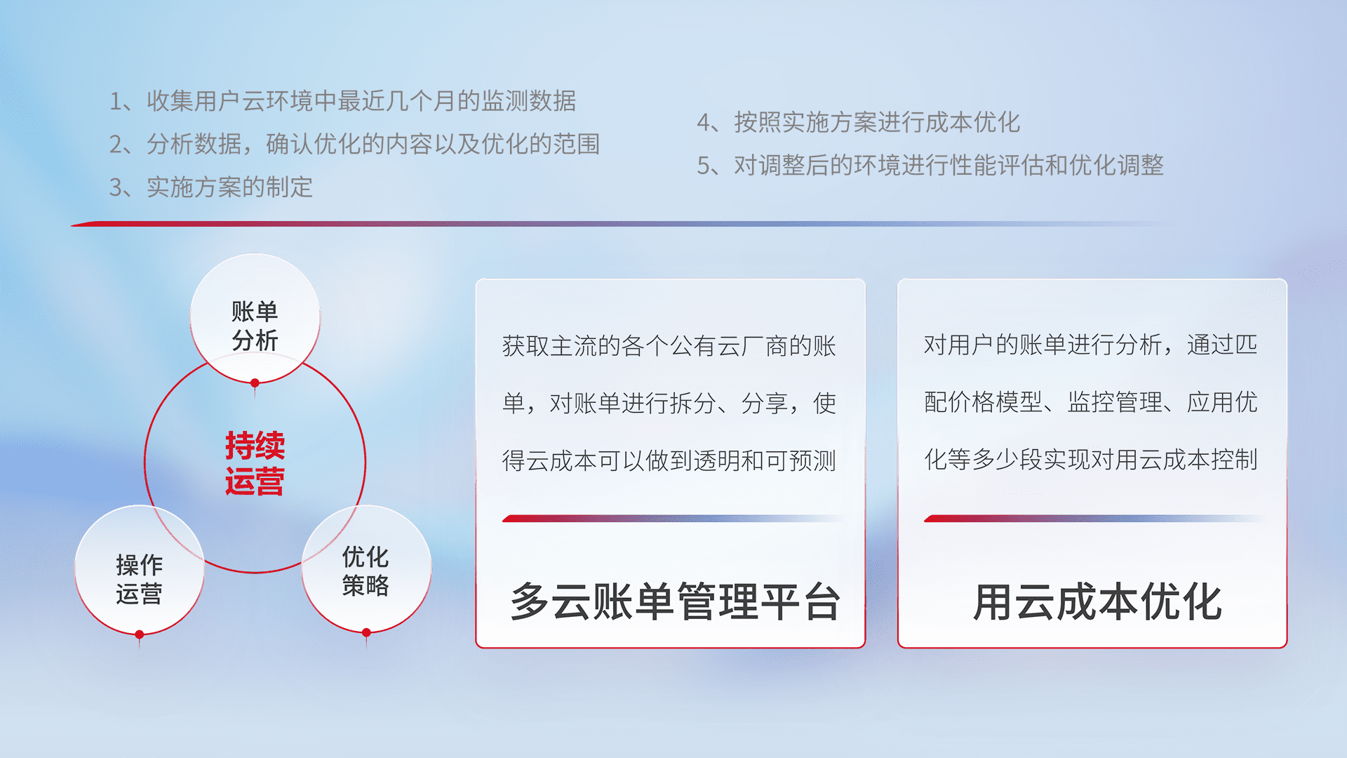 通过多云纳管,,以统一的资源数据模型把客户的云资源进行抽象和封装,,,,进而实现对多云资源的统一操作,,,,保障云资源管理的可靠性、、稳定性与可用性。。。。量身定制化运维内容,,,配置、、、开发运维、、、补丁管理、、、、备份、、、监控、、认证和访问管理、、、审计和日常巡检等,,,,保障在用云过程中的可靠度,,,稳定度以及高可用率。。。